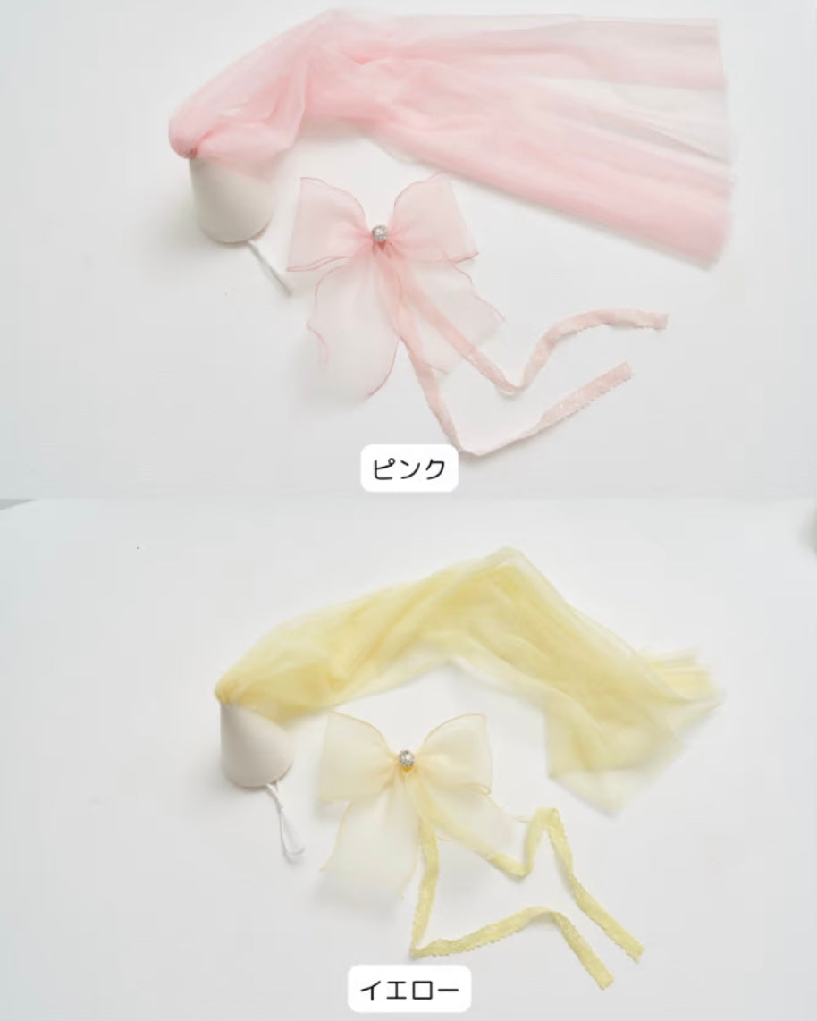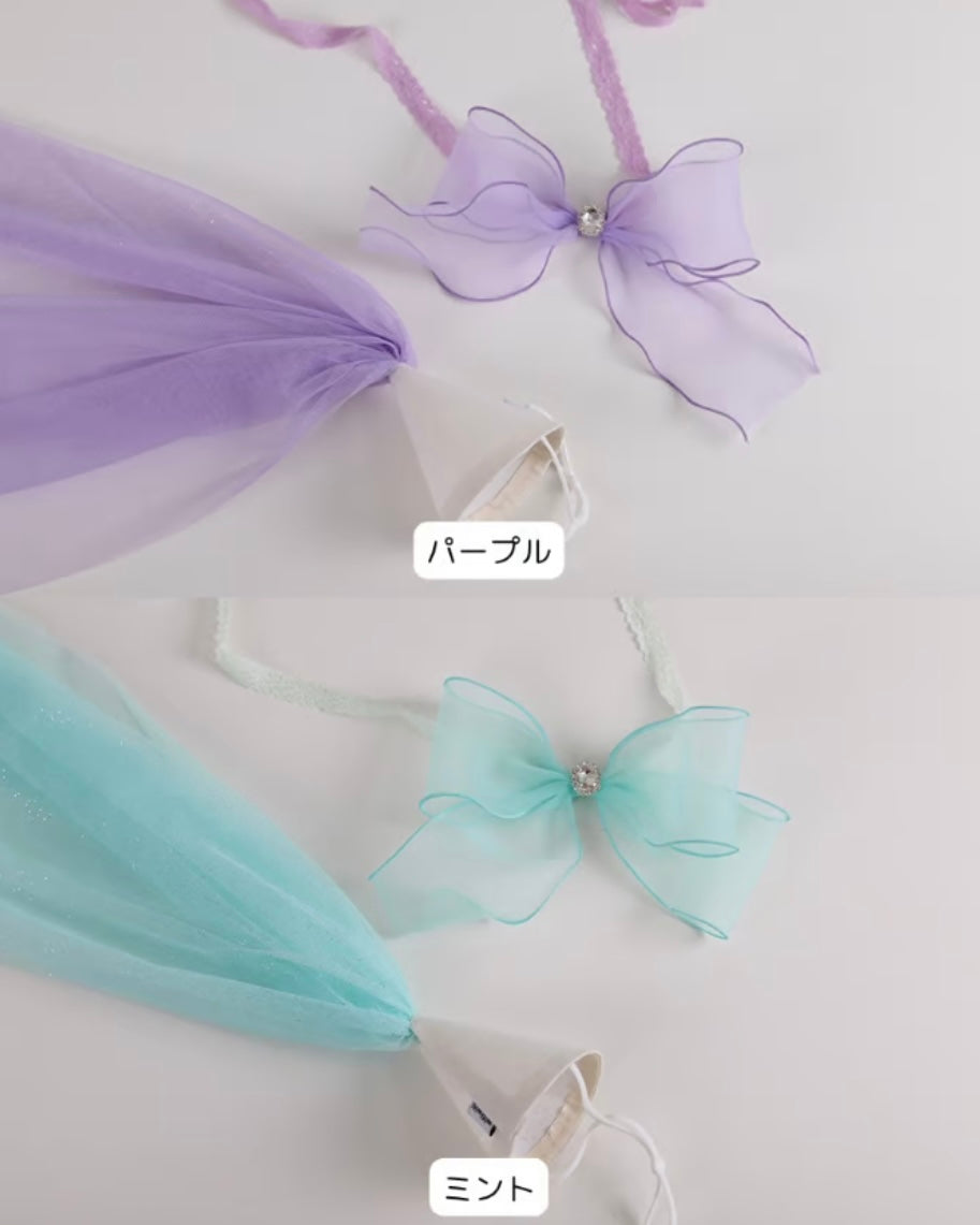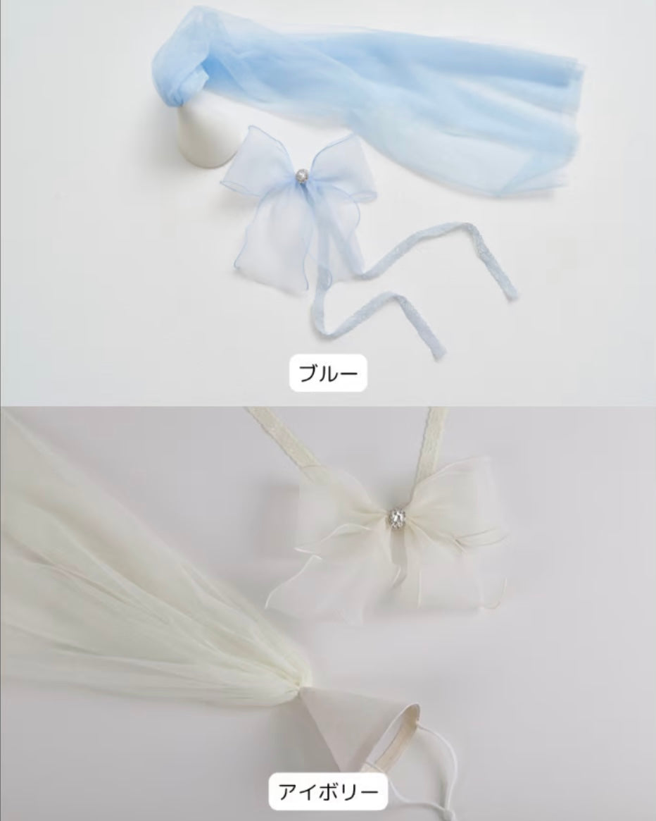 オーガンジーリボンで作つくられたリボンケープは、中心にキラキラ輝くジュエリーがついています。